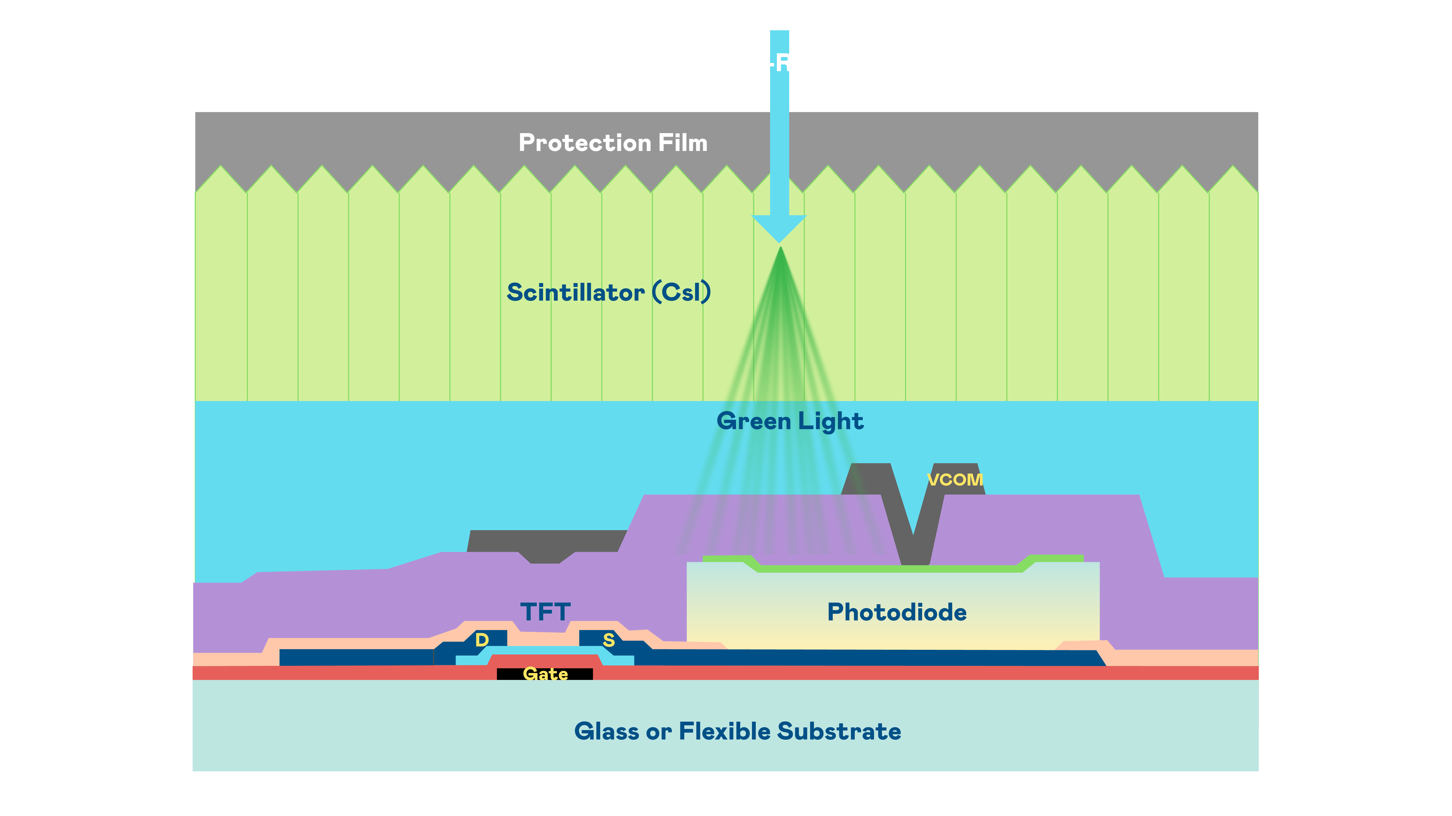 富易堂的X光影像感測陣列使用薄膜電晶體 (TFT) 作為每個像素的讀取開關,搭配光電二極體(Photodiode)的光電轉換元件,用以感測X光影像訊號。
